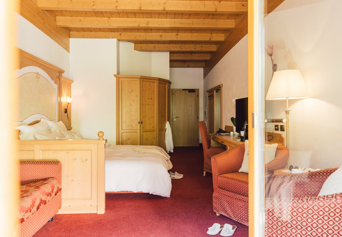Elegant und in dunkles Rot getunkt streckt sich die Himmelreichsuite im 3. Stock dem Himmel entgegen.